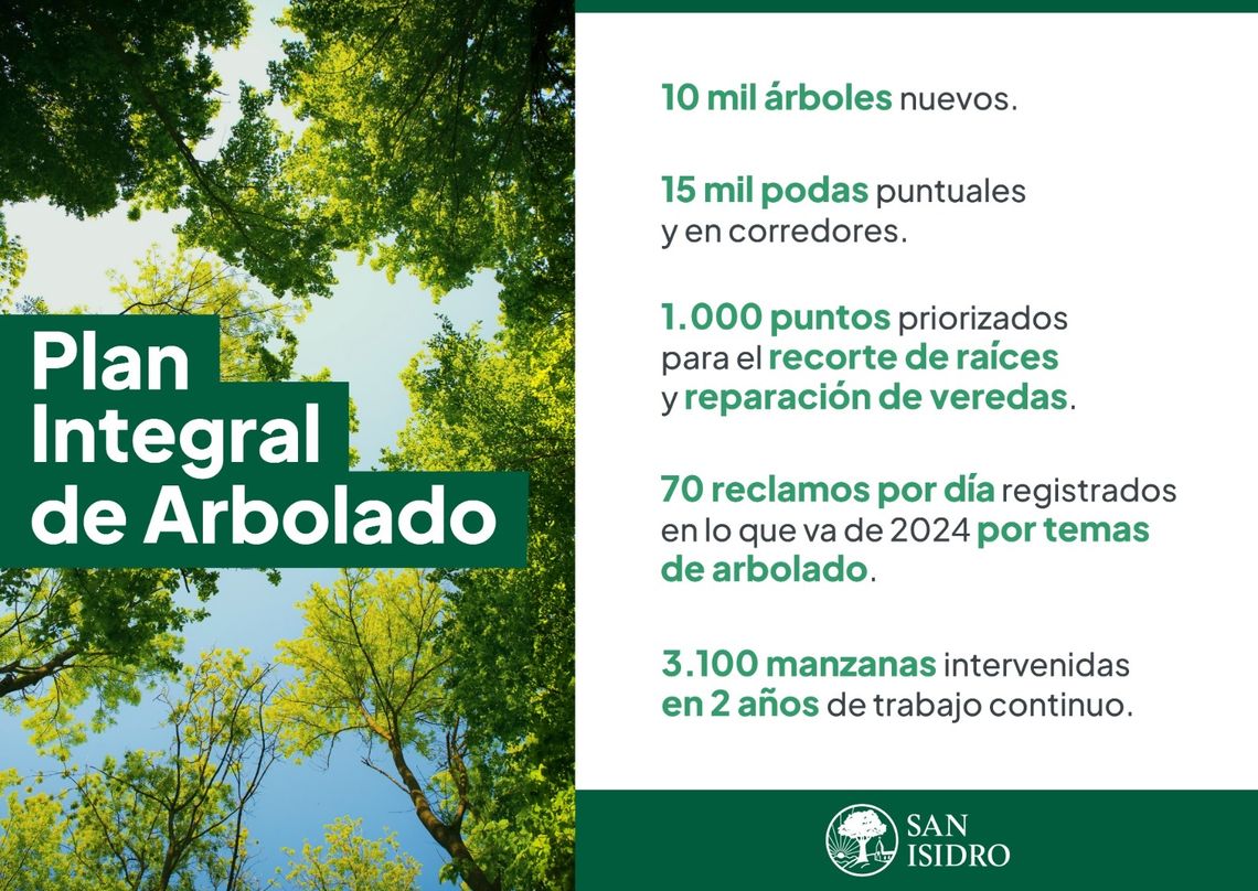 La Municipalidad de San Isidro lanzó el primer Plan de Arbolado integral para cuidar y preservar los árboles y las veredas. Se trata de un compromiso prioritario de la gestión que responde a una de las principales preocupaciones de los vecinos, es que en lo que va de 2024, se registraron por este tema 70 reclamos por día.