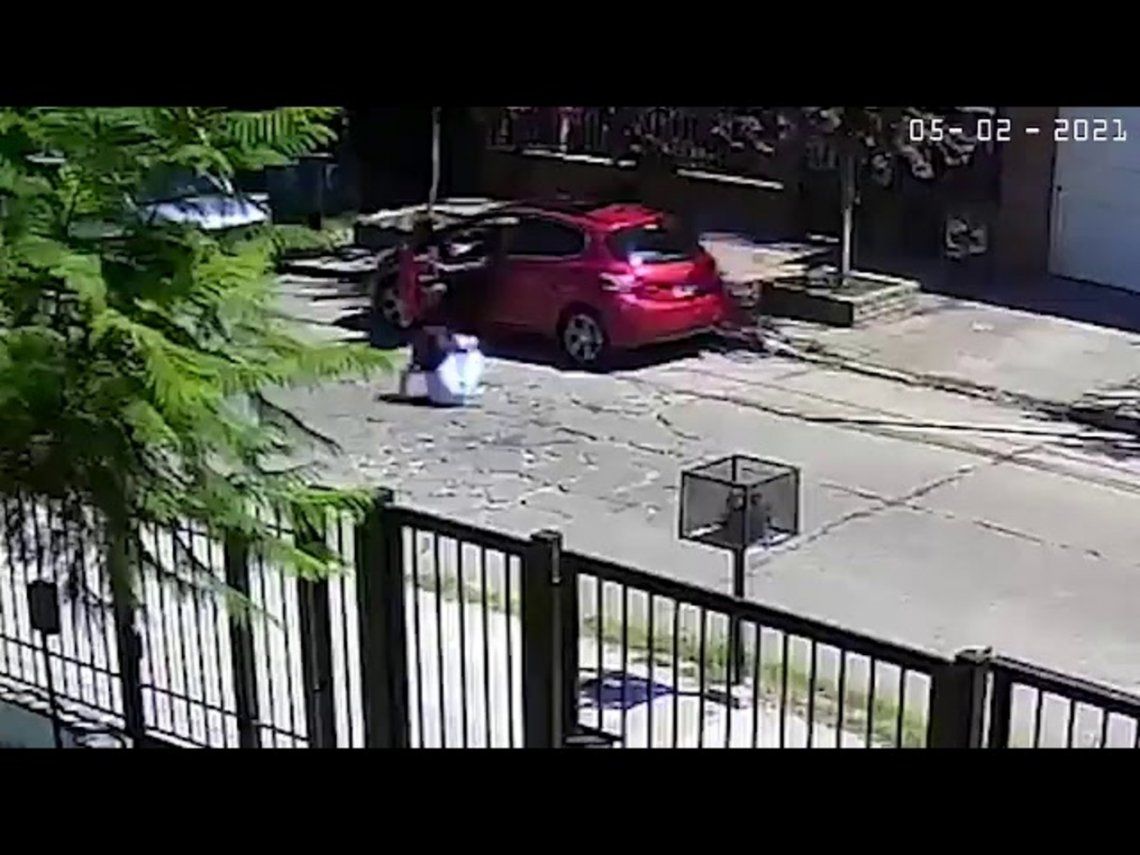 Según puede advertirse en imágenes registradas por cámaras de seguridad, la mujer, en el momento en el que iba a ascender a su auto Peugeot 208, fue sorprendida por dos jóvenes asaltantes de a pie.