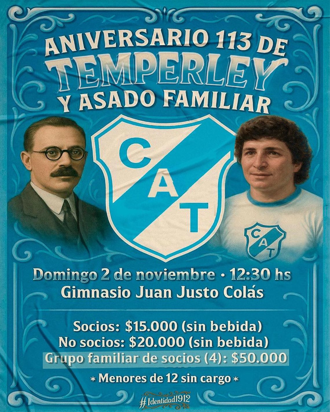 El Club Atlético Temperley se prepara para vivir una jornada especial. Con motivo de su 113° aniversario, la institución de Turdera celebrará el próximo sábado un gran asado para "La Familia Más Grande del Sur", en el gimnasio multiusos Juan Justo Colas, dentro del predio del club. Será una fiesta de reencuentro, amistad y pasión celeste, que reunirá a socios, hinchas y familias gasoleras.