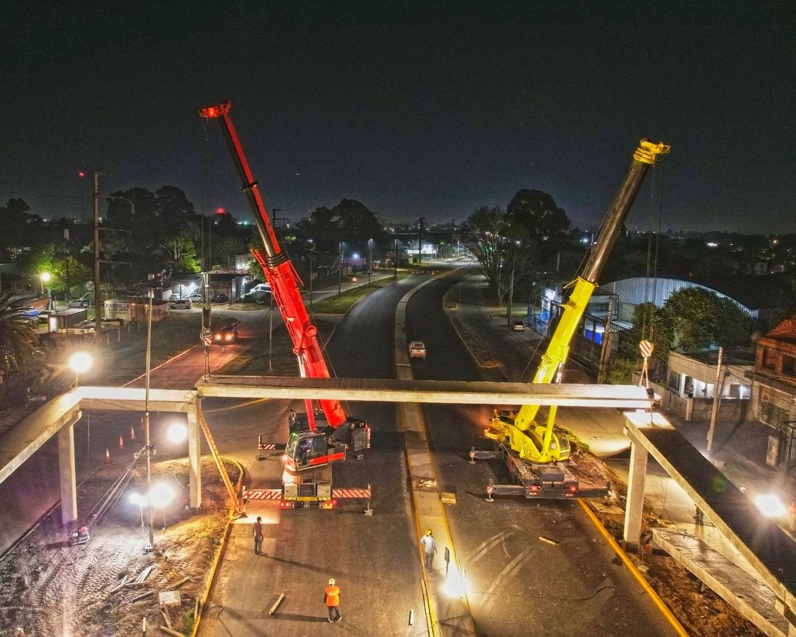 La pasarela, cuya colocación del brazo principal sobre la traza demandó un gran operativo, beneficia a vecinos, estudiantes y familias de varias instituciones educativas y trabajadores.