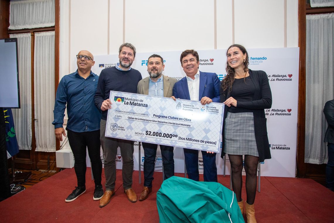 El intendente de La Matanza, Fernando Espinoza, junto con el ministro de Turismo y Deportes de la Nación, Matías Lammens, realizaron la entrega de cheques de apoyo económico por 2 millones de pesos y kits deportivos a distintas instituciones deportivas y clubes de barrio del distrito, que les permitirá realizar mejoras en infraestructura y realizar proyectos de ampliación, refacción y mantenimiento de sus instalaciones; en beneficio de miles de personas que practican actividades deportivas y recreativas en estas instituciones.