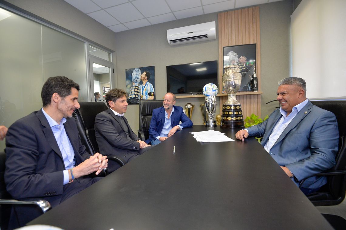 En el marco del programa Mi Identidad, Mi Derecho, el gobernador de la provincia de Buenos Aires, Axel Kicillof, se reunió este miércoles en Ezeiza con el presidente de la Asociación del Fútbol Argentino (AFA), Claudio Tapia, con quien suscribió un convenio para facilitar la inscripción y la regularización de la documentación de chicos y chicas que integran los clubes afiliados a la organización.