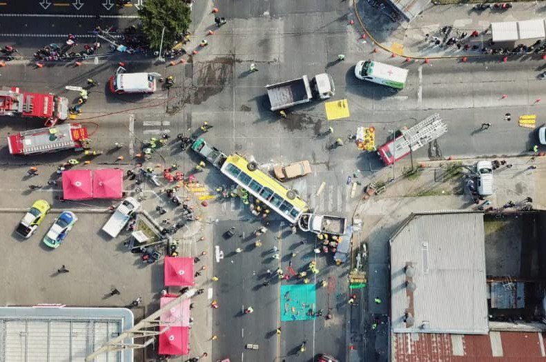 En el simulacro se representó un supuesto choque entre un camión de gran porte que impactó sobre el costado de un vehículo de transporte público el que, en su derrape, involucró a vehículos particulares y transeúntes provocando múltiples víctimas y daños materiales.