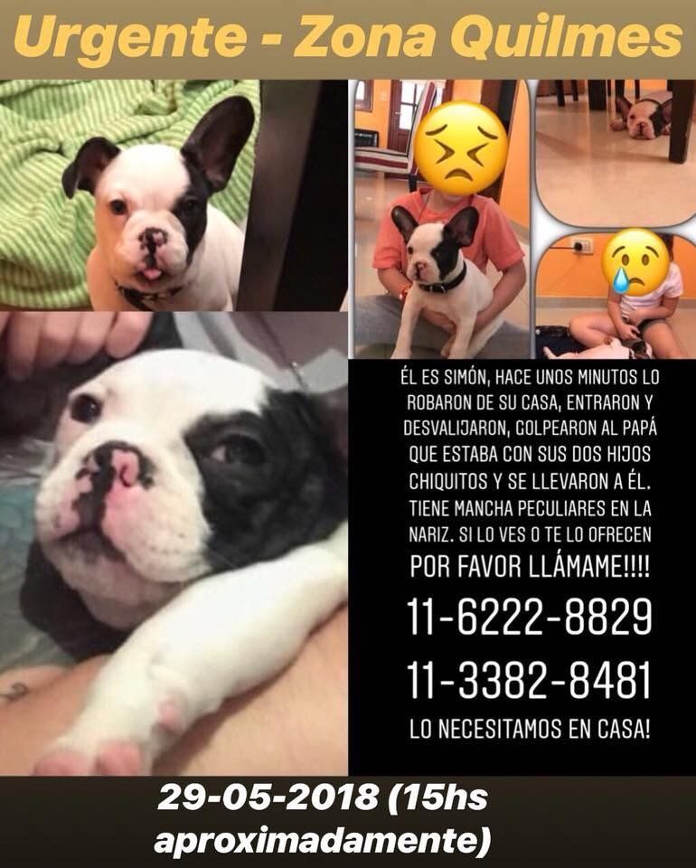 Una familia fue víctima de una violenta entradera en su vivienda de Quilmes Oeste, donde ingresaron tres delincuentes fuertemente armados que en pocos minutos robaron todos los objetos de valor, pero no conformes con el botín se llevaron hasta el perro, motivo por el cual se inició una campaña para tratar de recuperar a la mascota, que tenía un gran valor sentimental para los dos hijos del matrimonio.