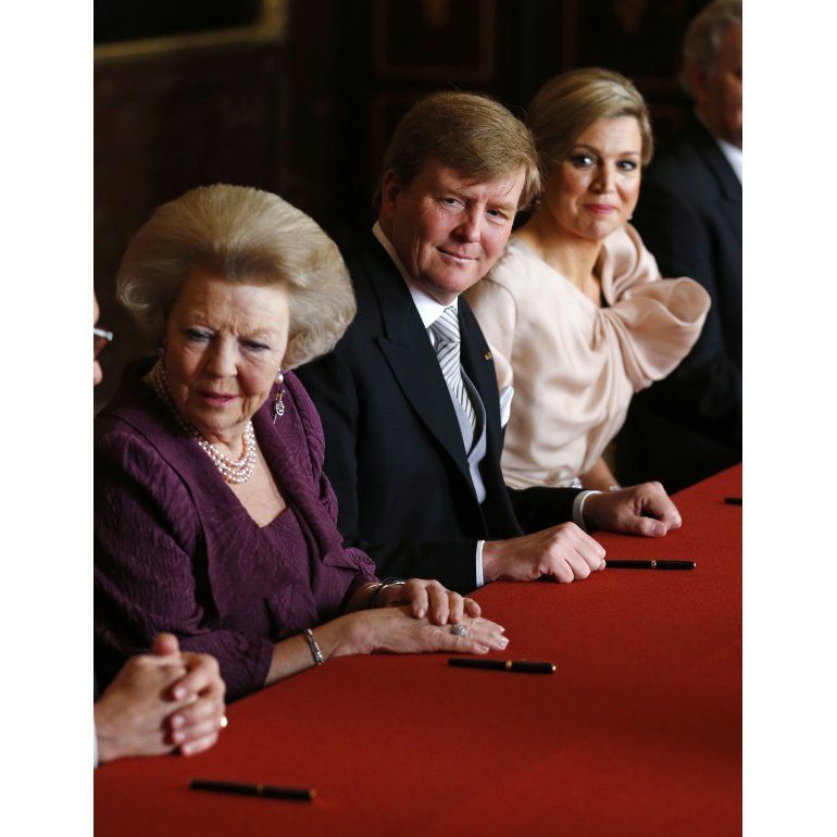 Al poner fin a su reinado de más de tres décadas, Beatriz, de 75 años, le dio la mano a su hijo después de que ambos firmaran el acta de abdicación, al igual que hizo Máxima como reina consorte.