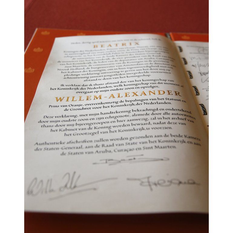 Estuvieron presentes y firmaron el acta, el primer ministro de Holanda, el liberal Mark Rutte, los presidentes del Senado y el Congreso de los Estados Generales de los Países bajos y los demás miembros de la familia real.