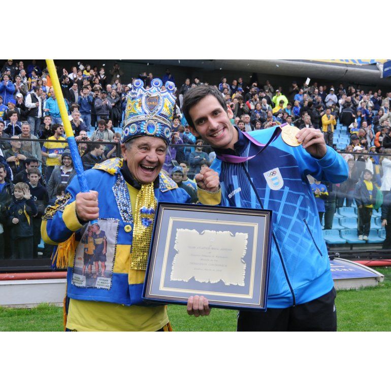 El taekwondista argentino, ganador de una medalla de oro en los Juegos Olímpicos de Londres, recibió una plaqueta antes del comienzo del partido de Boca y All Boys