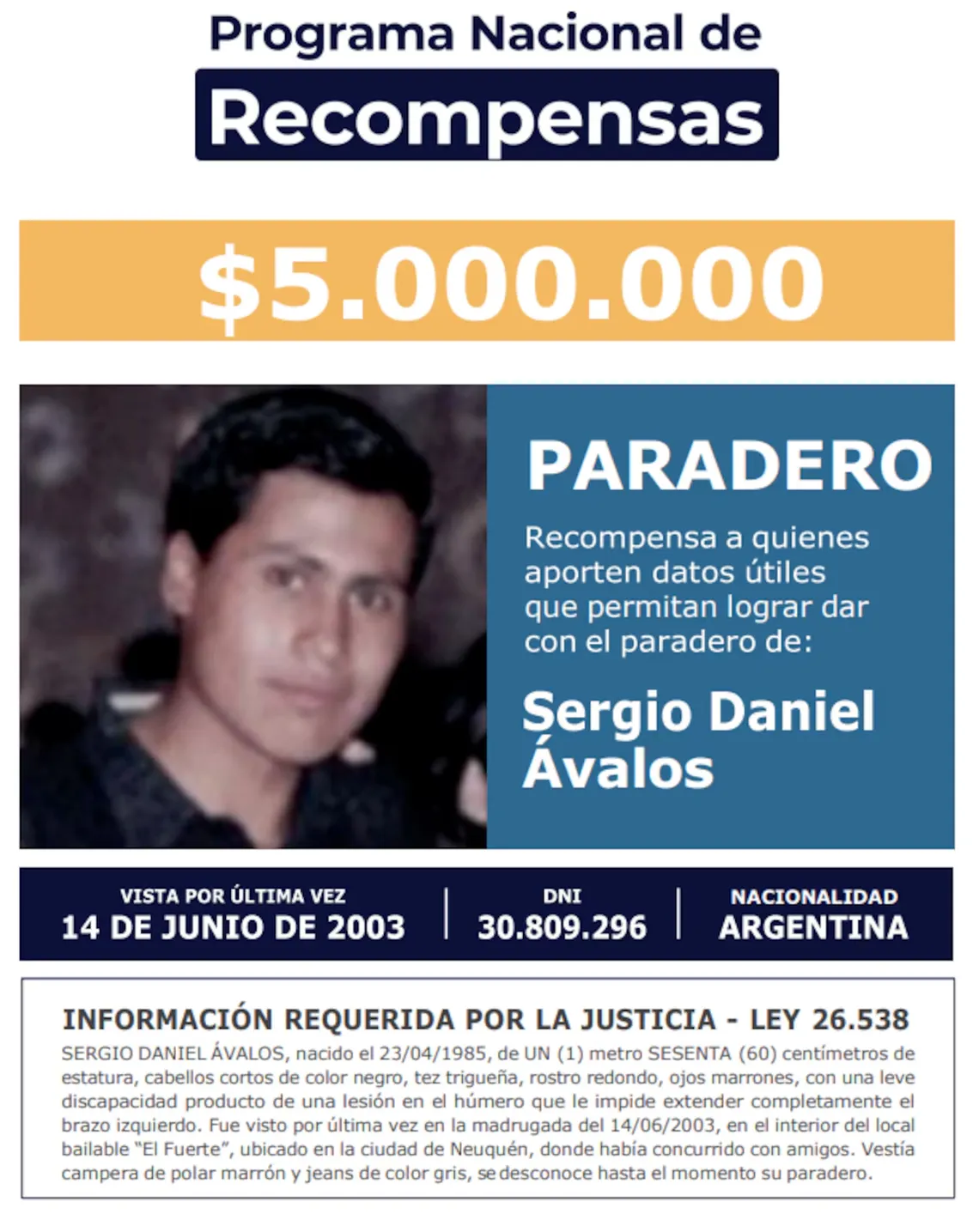 El Ministerio de Seguridad de la Nación oficializó un aumento en la recompensa destinada a quienes aporten datos que permitan avanzar en la investigación por la desaparición de Sergio Daniel Ávalos, el estudiante neuquino visto por última vez hace más de 20 años. El monto pasó a $5.000.000, según la resolución 1369/2025 publicada en el Boletín Oficial.