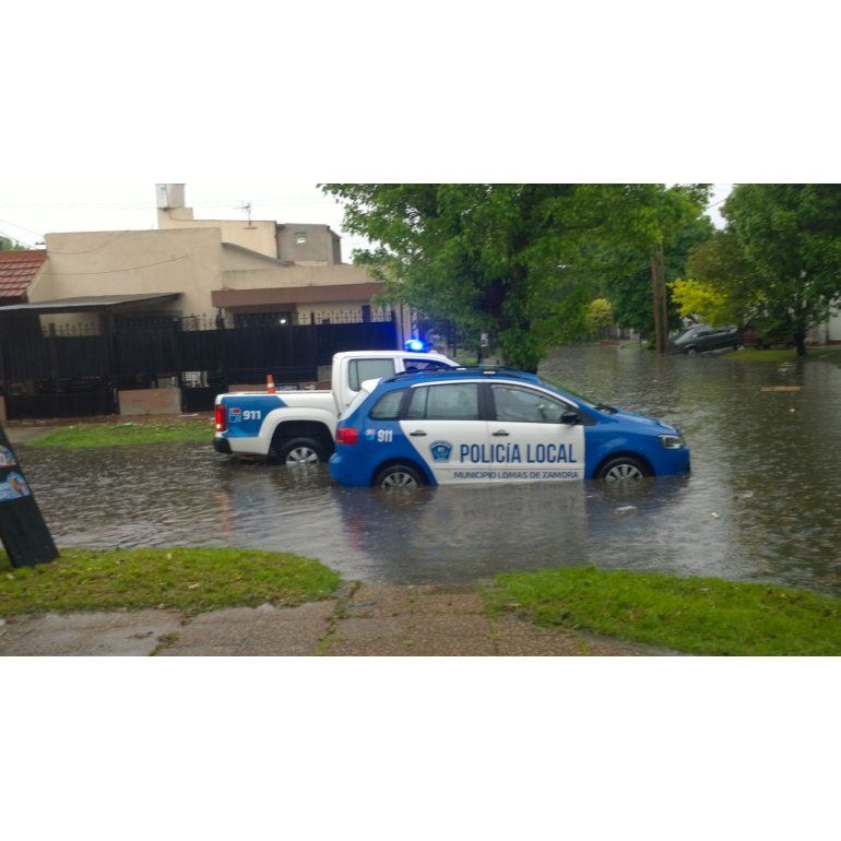 El móvil de la Policía Local de Lomas de Zamora varado en medio del "lago" que se forma en Vélez Sársfield y Sáenz Peña, como en tantas otras esquinas del sector Este de Temperley, es otro triste cuadro que da cuenta de los graves problemas de inundaciones que los vecinos esperan dejar de padecer con el inicio de la desobstrucción del entubado del arroyo Galíndez.