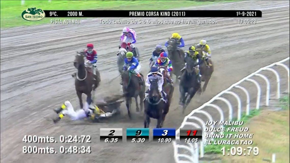 Una quíntuple rodada se produjo en la novena carrera del programa de este miércoles en el Hipódromo de San Isidro cuando la yegua Dulce Freud, que era conducida por Pablo Carrizo, se fracturó y dio por tierra con su jinete. Esa rodada produjo un accidente en cadena.