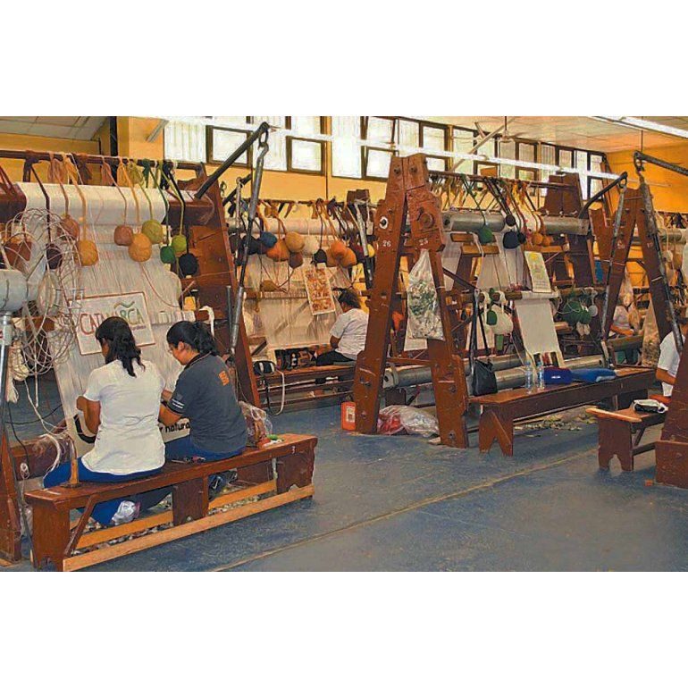 Los telares ocupan casi todo el salón en varias hileras, con sus estructuras de madera y ovillos de lana de varios colores y tamaño que cuelgan de los travesaños, según las características del tapiz o alfombra a elaborar.