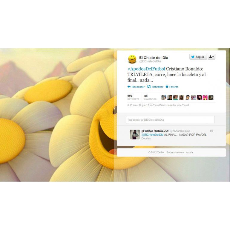 En Twitter, el hashtag #ApodosdelFutbol se convirtió en trending topic y despertó los comentarios más originales de los usuarios. Una recopilación Embed#ApodosDelFutbol Cristiano Ronaldo: TRIATLETA, corre, hace la bicicleta y al final.. nada...— El Chiste del Dia (@ElChisteDelDia) junio 28, 2012 #ApodosDelFutbol Carlos "el pizzero" Arano, Julio Cesar "carachata" Falcioni, Carlos "el Orejon de los Wachiturros" Luna— Jacobo Winograd (@JacoWinograd) junio 28, 2012 #ApodosDelFutbol Mouche, el Messi incomprendido— Nacho Ortelli (@ignacioortelli) junio 28, 2012 "Paco" Gerlo, siempre me pareció el mejor, hasta que apareció el "Chupa" Melano de Belgrano #ApodosDelFutbol — Lucas Ottolini (@LucasOttolini) junio 28, 2012 #ApodosDelFutbol JOSE LUIS "GARRAFA" SANCHEZ.— Agustina Occhipinti (@agus_Taladro09) junio 28, 2012 #ApodosDelFutbol Tomás Felipe "TRINCHE" Carlovich, René "LOCO" Houseman, Osvaldo "Pitón" Ardiles (No quiero saber porqué...)— Facundo Defrancesco (@facudefrancesco) junio 28, 2012 #ApodosDelFutbol el 'Cebolla' Rodriguez, el 'Casi Gol' Herrera, el 'Burrito' Ortega, el 'Chizo' Datolo, el 'Mago' Capria, el 'Chorro' Viatri— T-Bag (@teousoz) junio 28, 2012 #ApodosDelFutbol "Oveja" Telch, "Toscano" Rendo, "Manco" Casa, "Bocha" Maschio, "Panadero" Díaz, "Pájaro" Caniggia, "Pelusa" Maradona— Alejandro Wald (@alejandrowald) junio 28, 2012 #ApodosDelFutbol ivan "chocolatin" Castillo, la "araña" Amuchastegui, "casigol" Polanco...Pele debutó con un pibe— Bernardo Aguirre (@biejot) junio 28, 2012 "El Loco" "La Torre" "El Torero" "Mandraque" "La Pulga" "El Pitufo" #ApodosDelFutbol — nanito mena (@naniz_mf) junio 28, 2012 el mejor #ApodosDelFutbol es sin duda el "hijo del viento" Claudio Paul Canigia— Lupino (@nicofaluping) junio 28, 2012 #ApodosDelFutbol El "lagarto" Fleitas, el "Buitre" Butragueño, el "yerbatero" Gonzales, el "Pajaro" Hernandez, el "Lechuga" Roa— Guille Garcia Milo (@Guille_Holanda) junio 28, 2012